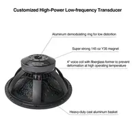 Cấu trúc loa: Sở hữu hai driver 18 inch, mỗi củ loa trang bị voice coil 4 inch và vòng từ khử méo (demodulation ring) bằng nhôm, cho phép tản nhiệt và xử lý công suất vượt trội.